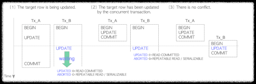 transaction snapshot과 연관이 있으며 아래 동작으로 인해 Lost Update 현상이 있을 수 있어 repeatable read or serializable isolation transaction에서는 중단이 필요함.