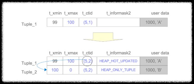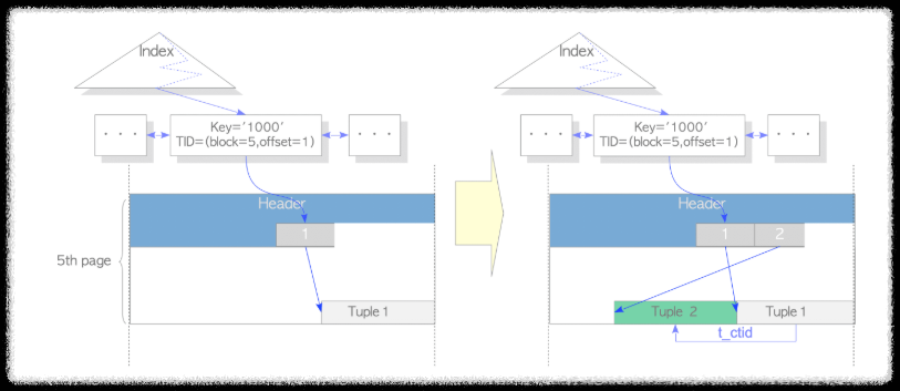 update된 row가 old row와 같은 table page에 저장될 경우 HOT 동작