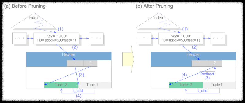 그래서 pruning 작업으로 index tuple이 가리키는 line pointer를 live tuple을 가리키는 line pointer로 redirect되도록 함.